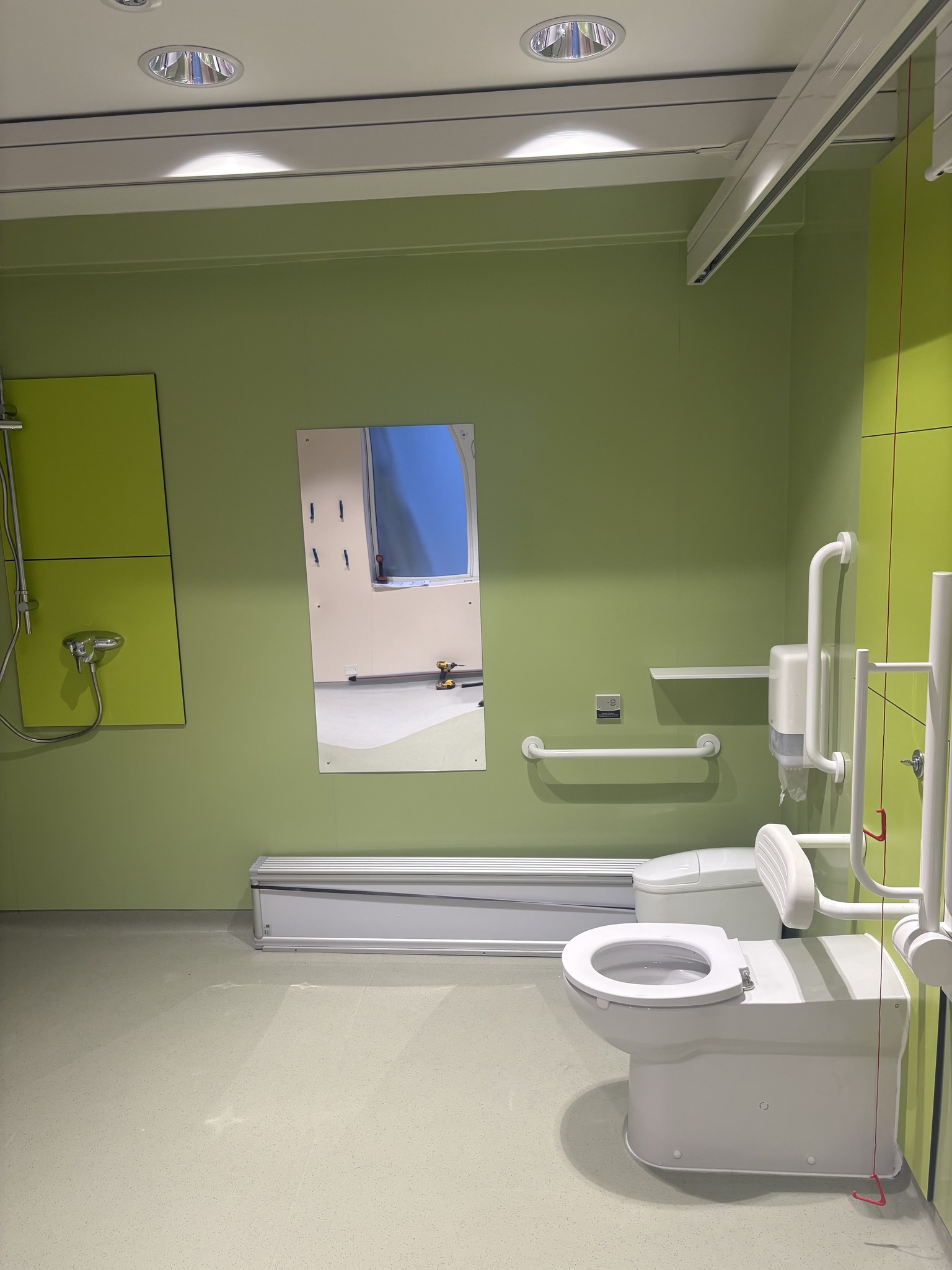 The Changing places toilet with green walls includes a height adjustable adult sized wall mounted bench, Hoist – full ceiling, loop, Peninsular toilet, Height adjustable wash basin, Privacy Screen, Drop down grab rails, Wall grab rails, Colostomy Shelf, Paper Roll, Large Bin, Emergency Alarm, Non-slip floor, Mirror Coat Hooks and Shower facilities.