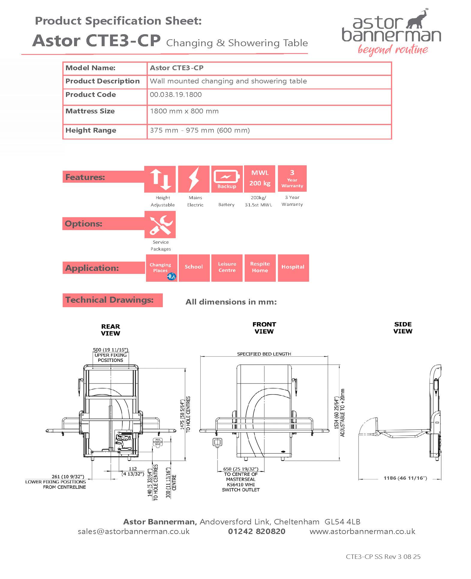 The Astor CTE3-CP wall mounted changing table is simple to operate via a handset control, and is a comfortable, reliable and sleek choice. The durable stretcher material is comfortable as well as quick and easy to clean. This, along with part stainless steel construction gives many years of worry free use, even in wet and humid or multi-user environments.