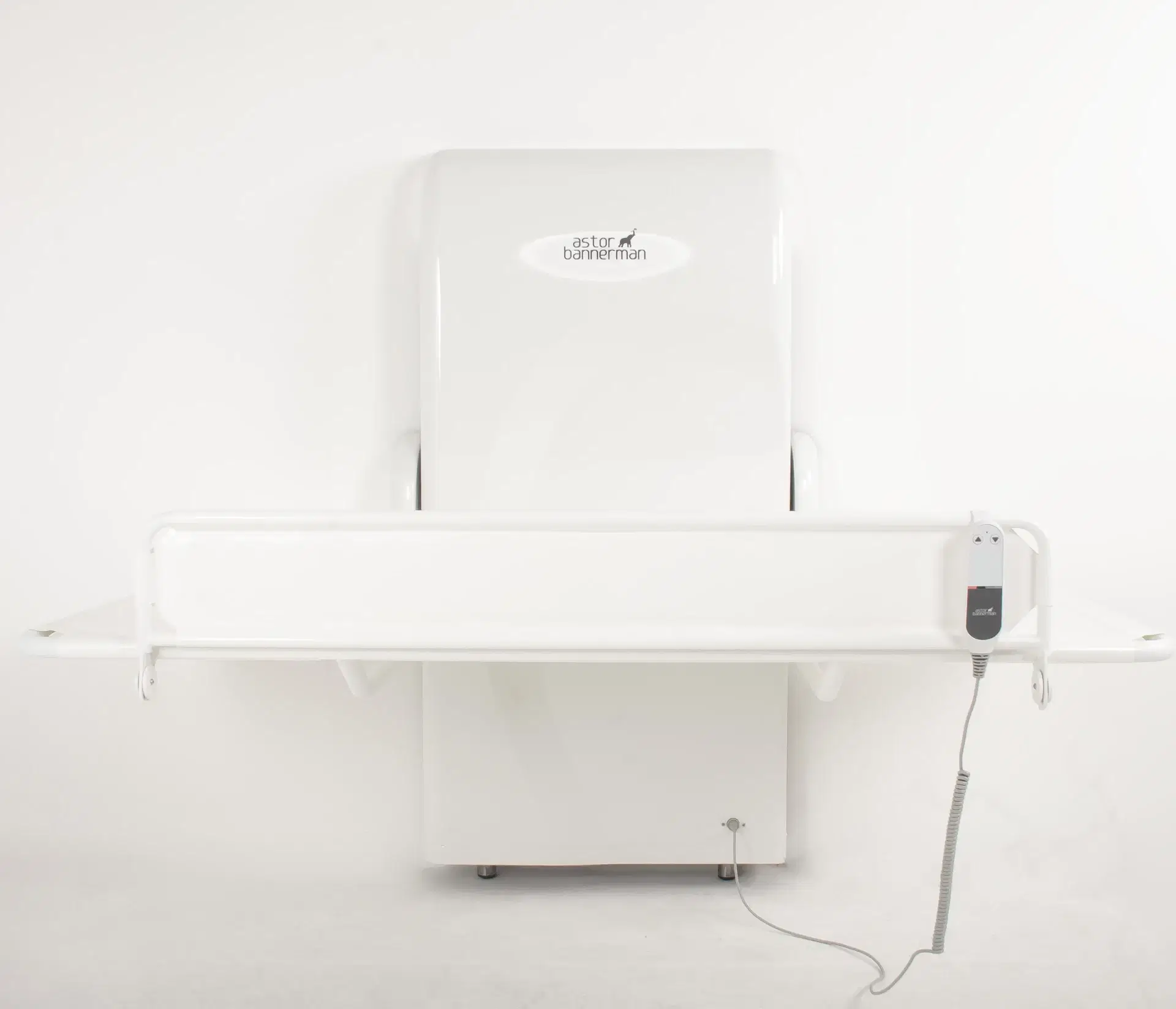 The 600 mm travel range enables the user to be gently lifted to a safe and comfortable working height for washing, showering, changing and dressing. The platform stows neatly when not in use, held in place with twin gas struts, and features battery back-up for safe lowering in the event of a power failure.