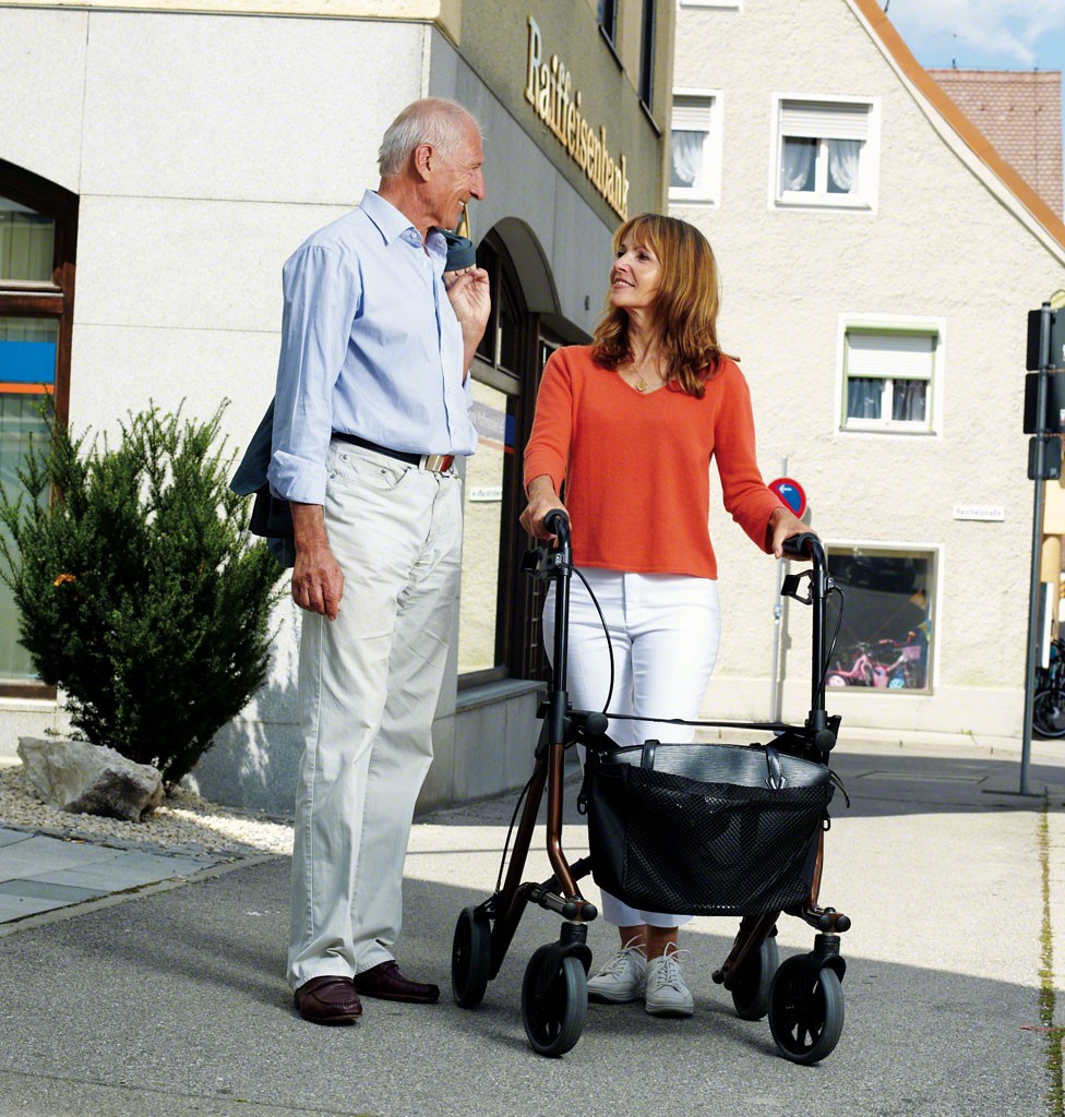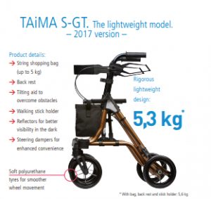 The TAiMAM Rollator is the classic rollator from Dietz. Weighing only 6.5kg, this lightweight model provides the highest possible stability. Easy to fold for transporting, the Dietz TAiMA M from MMS Medical includes a mesh shopping bag and a walking stick holder to allow you go about your business effortlessly. The tilting aid allows obstacles to be overcome with ease. Steering dampeners are also a feature for enhanced convenience. The TAiMA M rollator combines an attractive appearance with portability and stability and has set a new benchmark for standard rollators.